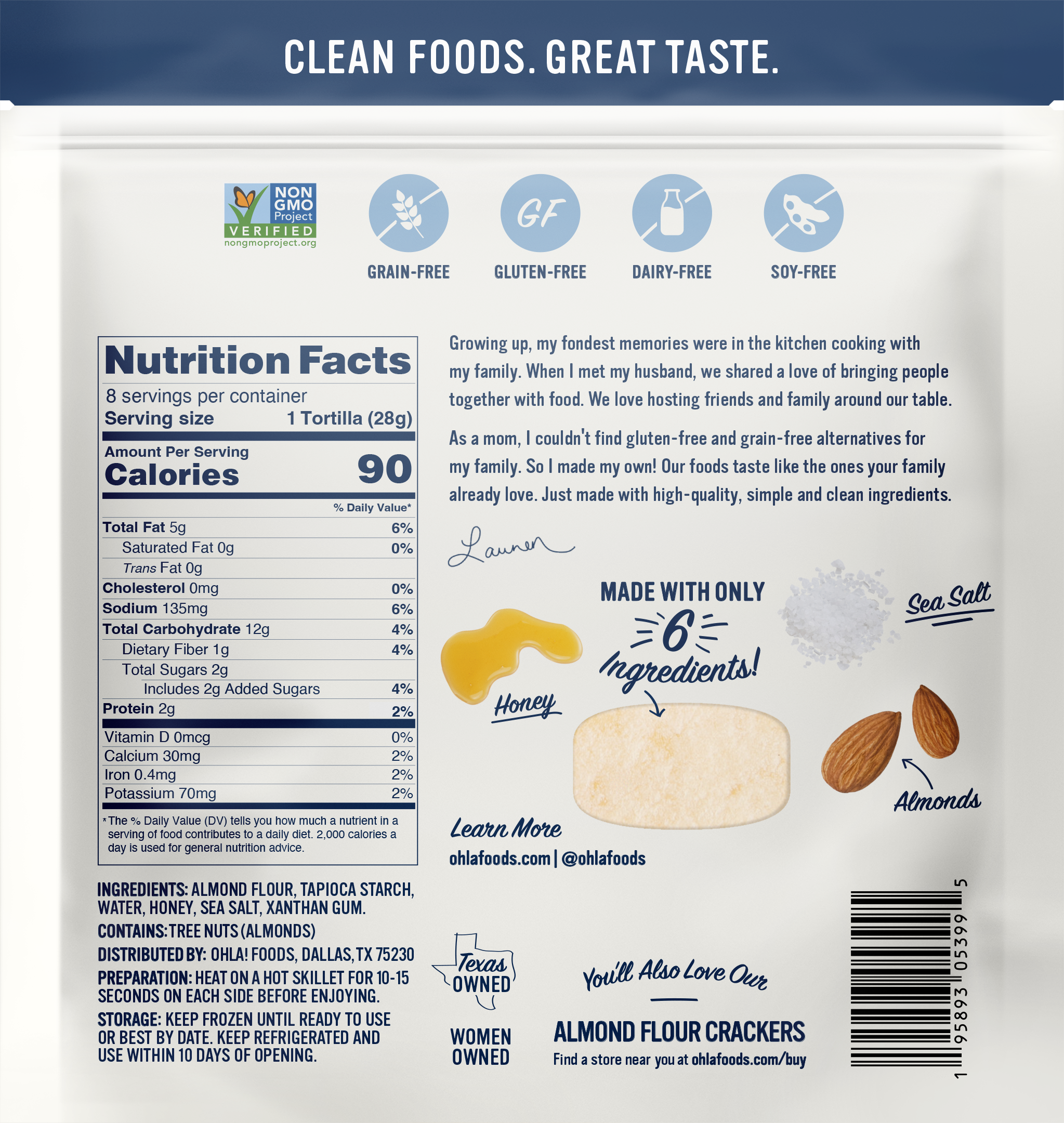 Almond Flour, Tapioca Starch, Water, Honey, Xanthan Gum, Sea Salt Preparation: Heat on a skillet for 10-15 seconds on each side before enjoying Storage: For best results, keep refrigerated for up to two weeks or freeze