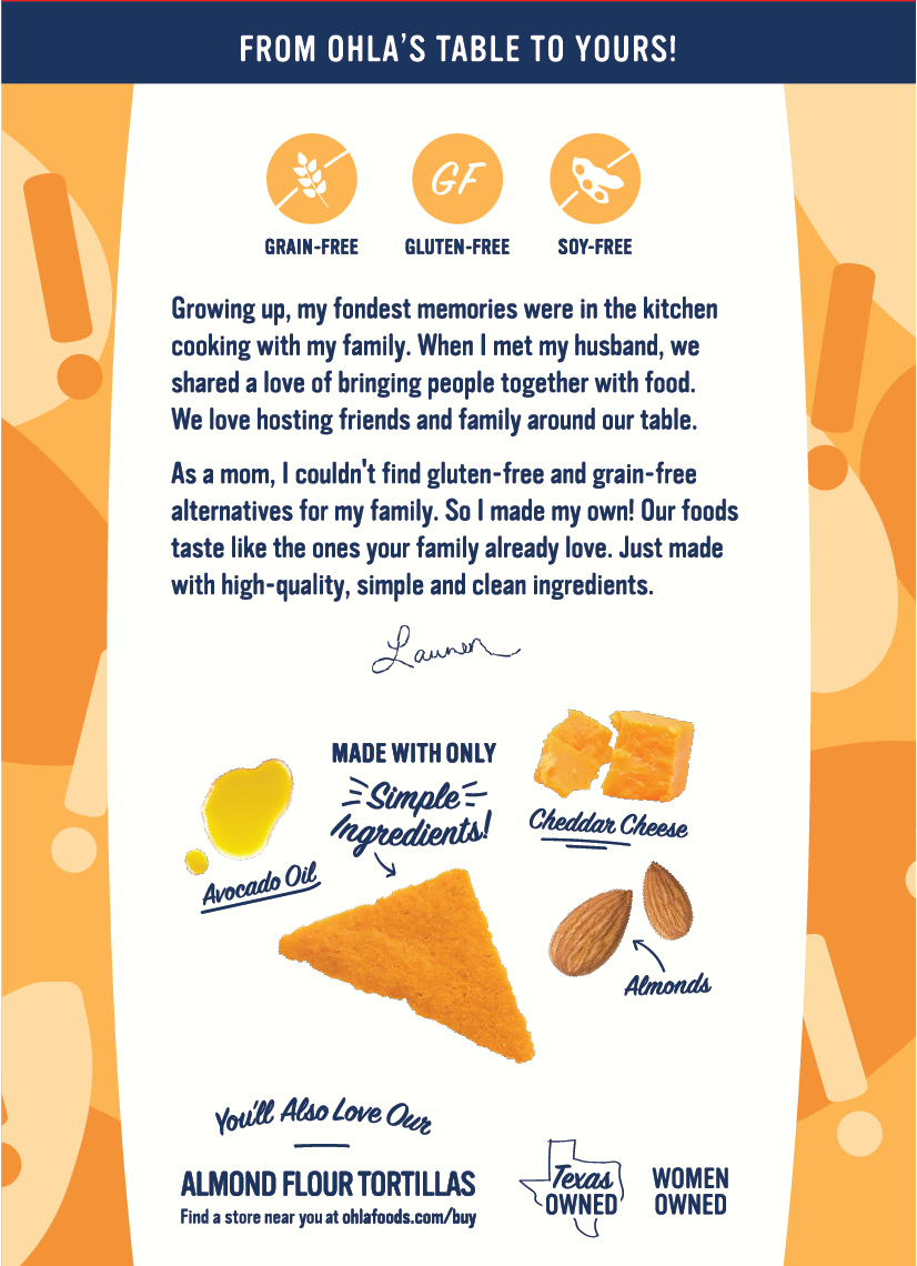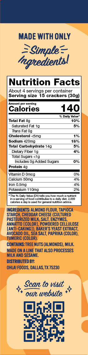 Almond flour, tapioca starch, cheddar cheese (cultured pasteurized milk, salt, enzymes, annatto (color), powdered cellulose (anti-caking)), baker’s yeast extract, avocado oil, sea salt, paprika (color), turmeric (color)
